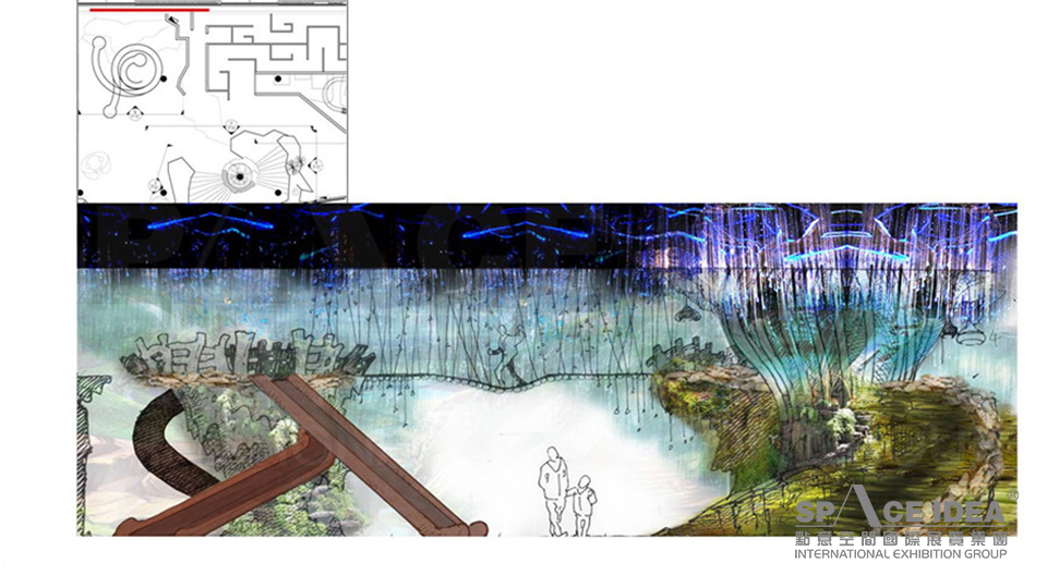 第四個展廳就充滿童趣了,仿佛叢林般的場景:巖洞中的星星點點、不經(jīng)意的探頭熊叫,使驚魂山洞充滿神秘色彩;沿路而上進入?yún)擦炙鳂颍庀氩坏降幕蒹w驗,帶來趣味無限。