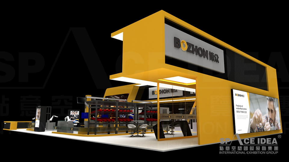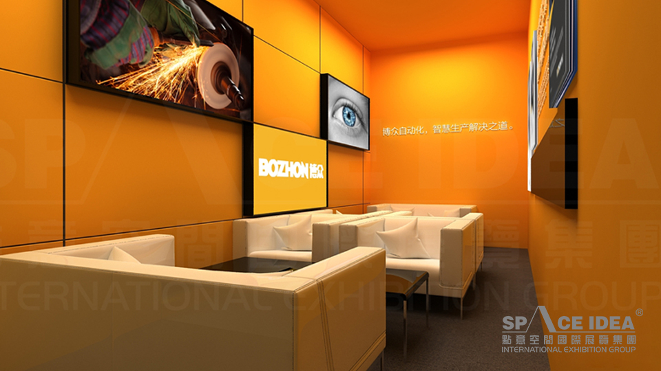 提取博眾品牌LOGO中的黃色及黑色來進行環境的渲染,營造半封閉空間來進行展示,通過場景的修飾、道具的展開,給人一種非常高端的感受。選擇現代感極強的高分子化合物與不銹鋼相結合的材料,體現博眾專注智能制造,以技術創新為核心的企業形象。休息區域桌椅均采用高分子化合物為主材料進行展具的排列,整體風格一致,又相互映襯。