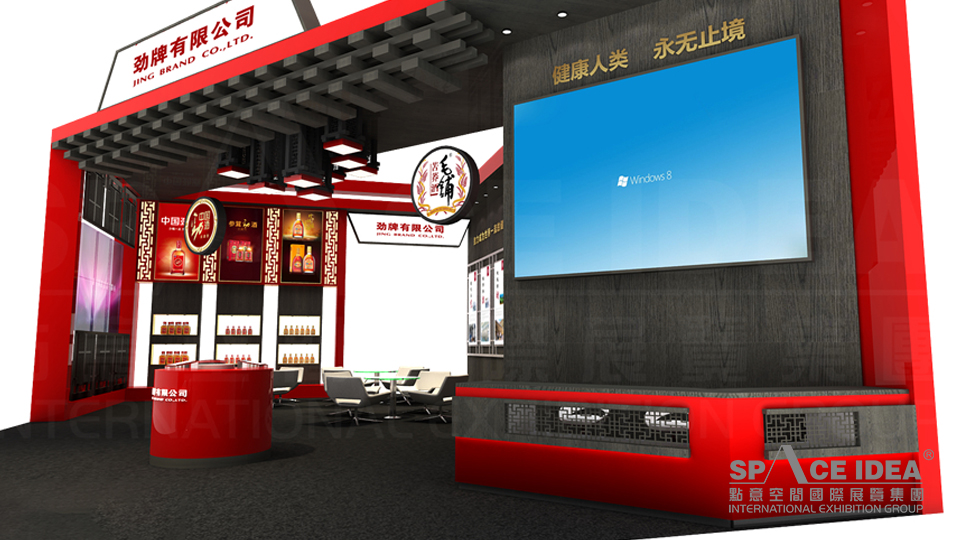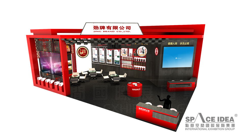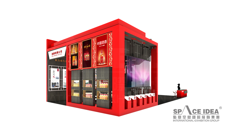本案以中國(guó)紅為主色調(diào),配以黑色的內(nèi)墻與地板,極富視覺沖擊力。采用中式櫥窗來擺放勁牌各種酒產(chǎn)品,中間擺放了三張桌椅,觀眾可以一邊休息,一邊品嘗勁牌名酒。入口處的大型LED屏播放勁灑的制作工藝,傳播勁牌酒業(yè)的企業(yè)文化及理念追求,體現(xiàn)了勁牌酒業(yè)對(duì)健康生活的不懈追求。
