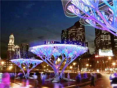 這一批波斯頓環(huán)保樹是由法國團隊MarioCaceres&ChristianCanonico完成,展示在波士頓公園內(nèi)。該項目集成了多種城市綜合設(shè)備,使用回收和循環(huán)再用的塑料制成。這些人造樹體現(xiàn)并提高了自然樹木最重要的生物學(xué)特性:消化二氧化碳并釋放氧氣,從而清潔空氣。這次合作的目的是在短時間內(nèi)達到波士頓的全球性減碳目標,并給人類足夠時間從現(xiàn)在的化石燃料經(jīng)濟時代進入到一個新的零碳能源經(jīng)濟時代。